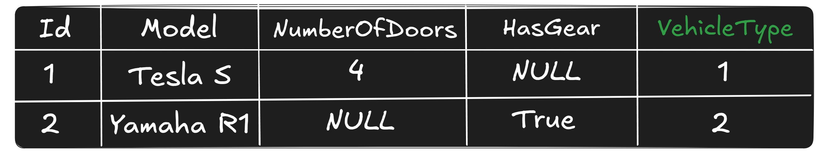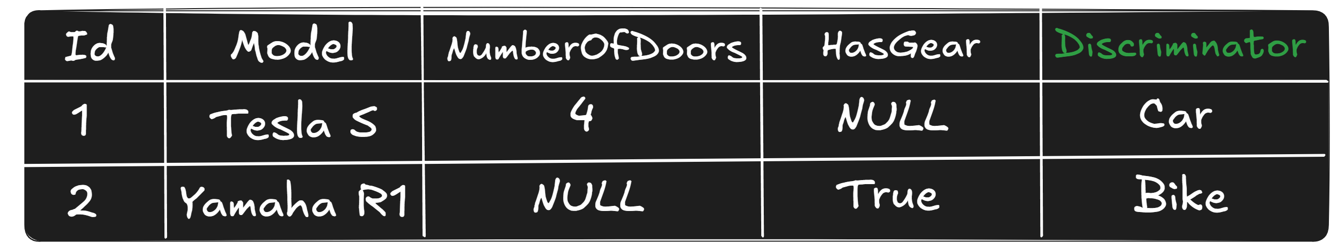 public class Vehicle{ public int Id { get; set; } public string Model { get; set; } = string.Empty;} public class Car : Vehicle{ public int NumberOfDoors { get; set; }} public class Bike : Vehicle{ public bool HasGear { get; set; }}